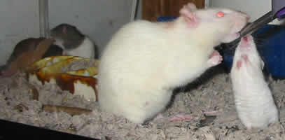 My rat obsession hit a new level shortly thereafter. I would often to go pet stores to pick up supplies for my rats. There I would usually see rats up for adoption that people didn't want anymore. One time I found this family of rodents stuffed in an aquarium. When I inquired about them, the store clerk said I could adopt them for $5. I said all of them, including the mouse? I couldn't resist their charm so at the end of the day I had 11 more adult and baby rodents including Mr. Mouse.
