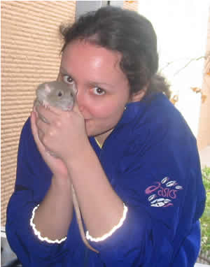 Six months later, Sarah adopted a new rat, Finnigan, from the local rat show where she was going to college in California. Finnigan was a blue agouti dumbo. When she brought him back during spring break, she tried to breed him with my rat Nezumi. Finnie is such a lovable rat. He kept her company while she was away at school.